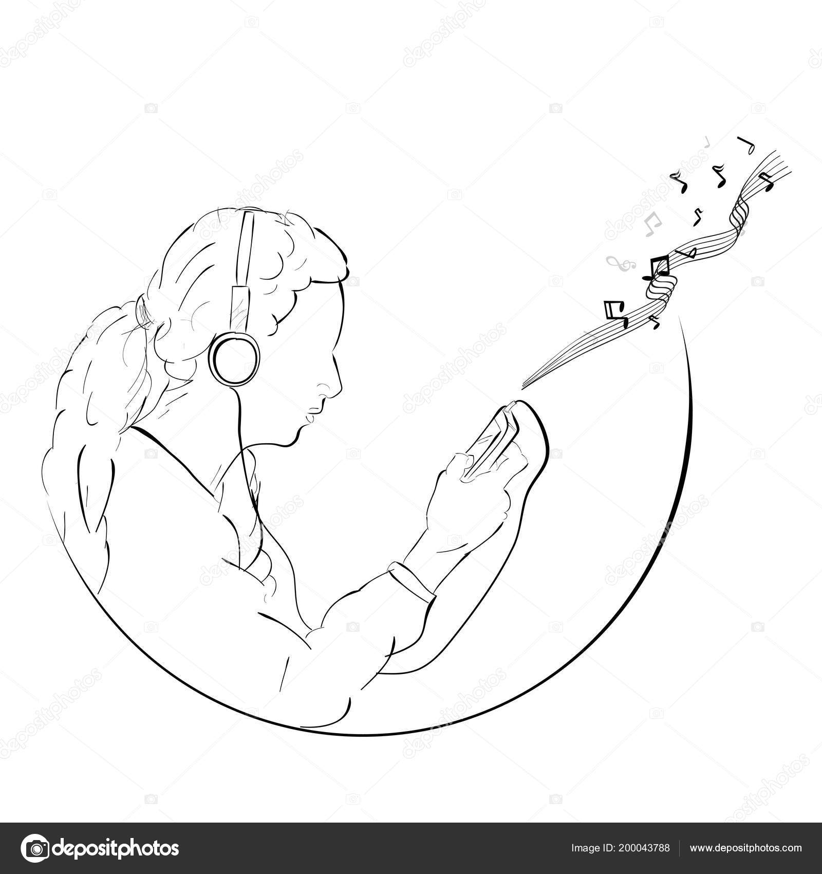 Image Of Simple Sketch Long Curly Hair Sitting Young Girl Listening