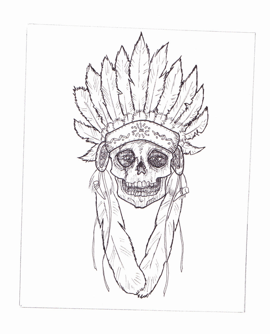 Image Of Hand Drawing Of Native American Indian Headdress With Human Skull