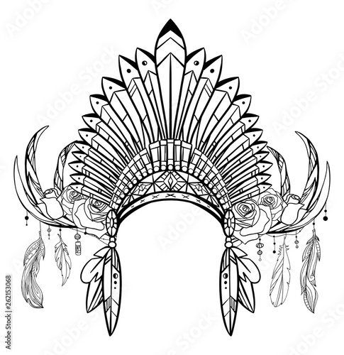 Image Of Outline Drawing Of Native Cap Of Indian With Feathers